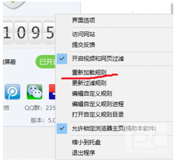 规则文件编译完成后,请关闭文件编辑器,再次右键单击“ADBlock广告过滤大师”界面,显示右键菜单,点击“重新加载规则”: