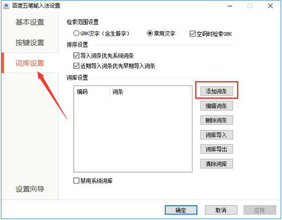 2.在设置窗口的最左侧,单击& ldquo词典设置& rdquo选项切换到此内容,然后点击如图& ldquo添加条目& rdquo按钮。